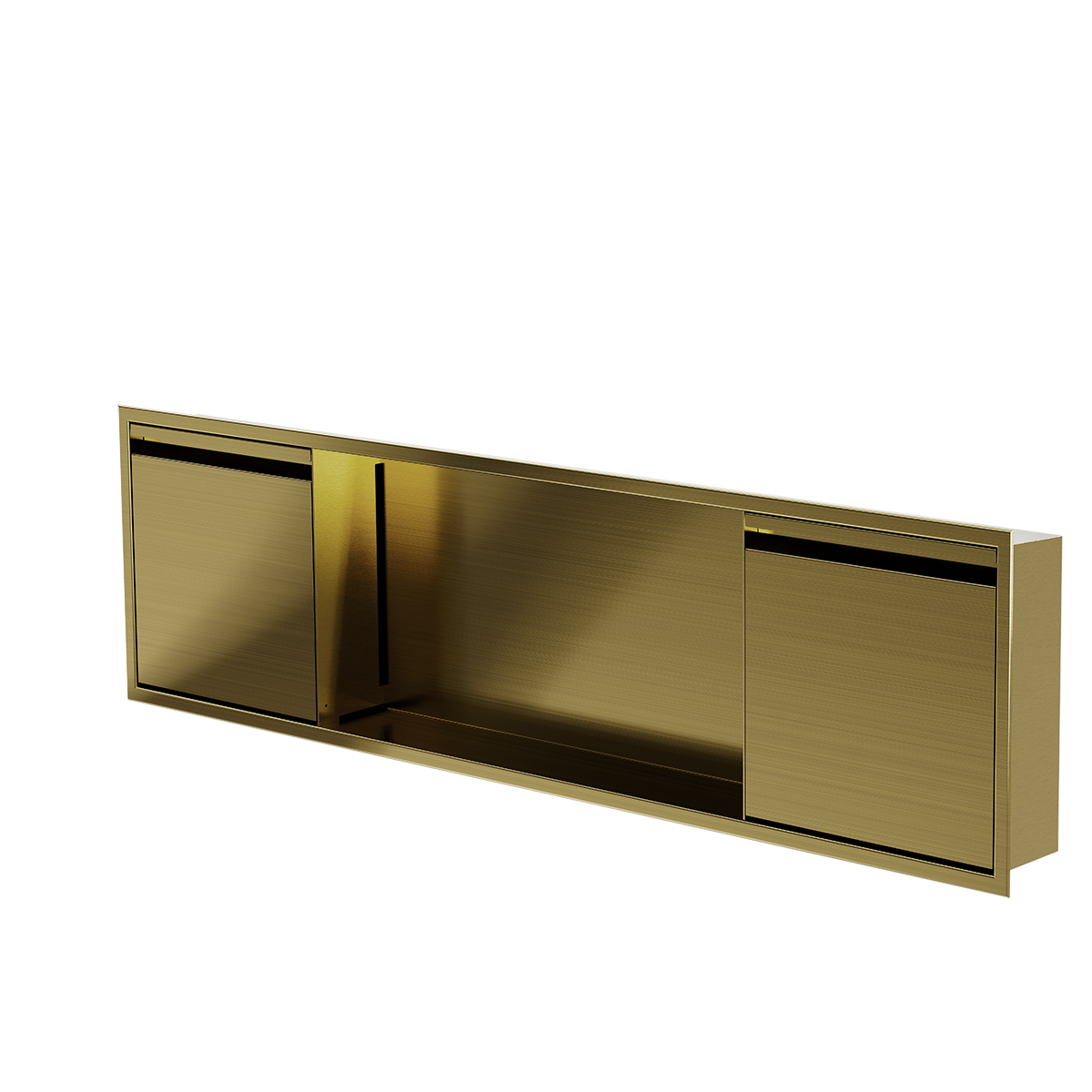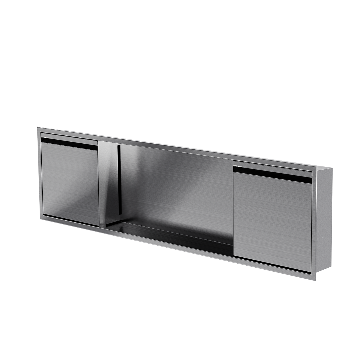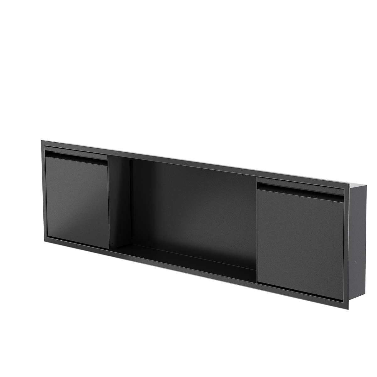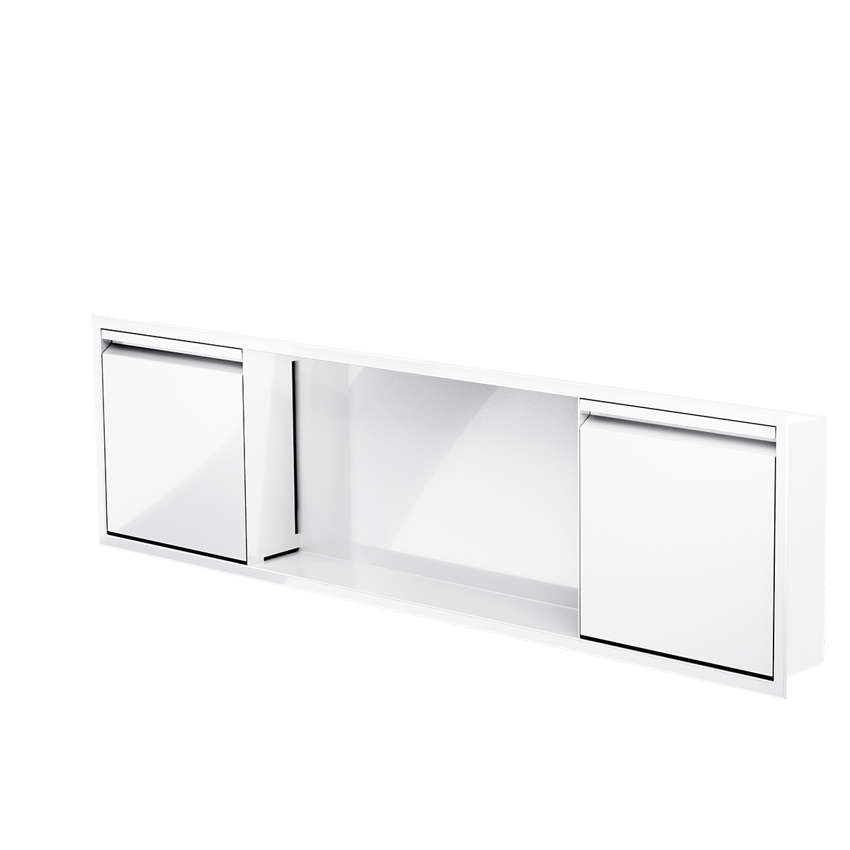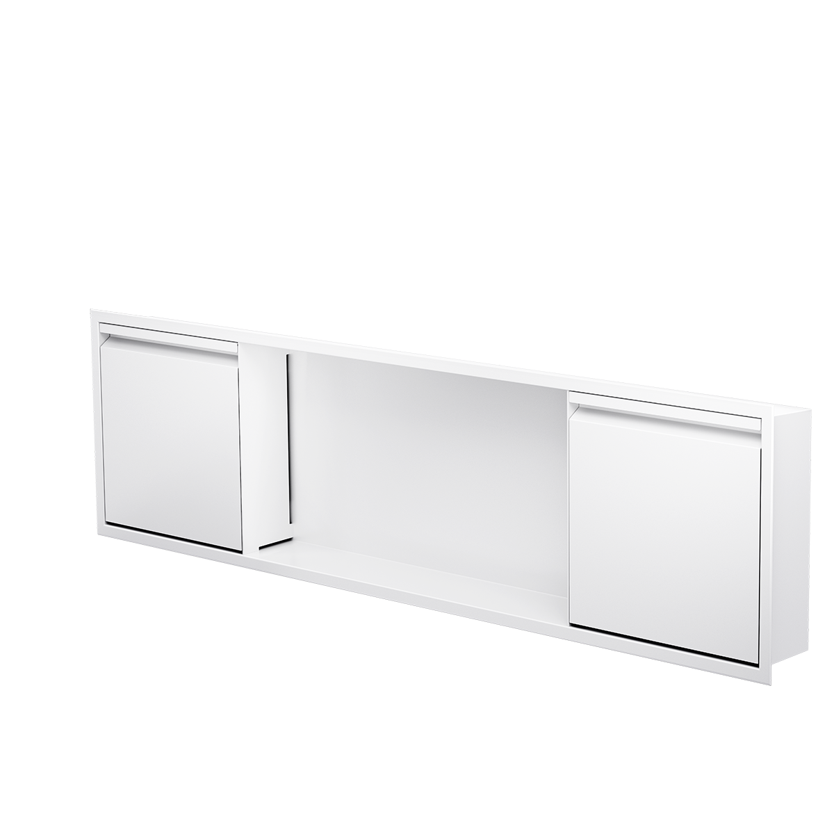 For projects that need extra space and sleek organization, the 12×48 niche with doors offers a generous layout with smart functionality. It features a central open section for daily items, flanked by two closed compartments for hidden storage.